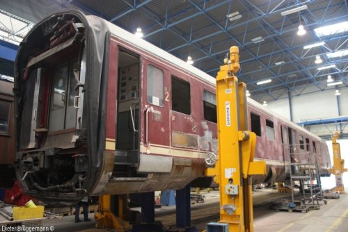 Der Mittelwagen, aufgebockt und sofort erkennbar: Viele Teile mussten ausgewechselt werden und sehr viel Arbeit wartet noch.