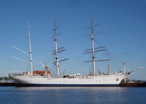 Das als Bark getakeltes ehemalige Segelschulschiff Gorch Fock I wurde 1933 bei Blohm & Voss für die Reichsmarine gebaut. Seit 2003 liegt das nicht seetüchtige Segelschiff im Stralsunder Hafen · © J. Wiegmann