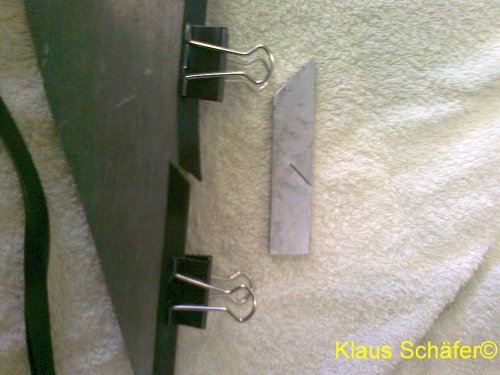 3. April 2012: Dies ist eine selbstgebaute Vorrichtung zum Zuschneiden und Verkleben der neu anzufertigenden Gummidichtungen für die Fenster.