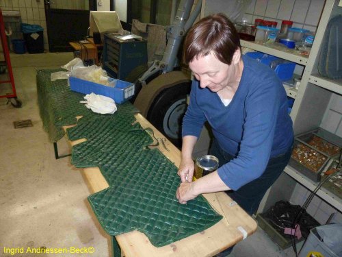 5. Juni 2012: Die grüne Cockpitwandverkleidung ist nur teilweise erhalten und befindet sich in keinem guten Zustand. Sie muss gereinigt und an vielen brüchigen Stellen geflickt werden. Bisher haben wir keinen passenden Ersatzstoff gefunden.