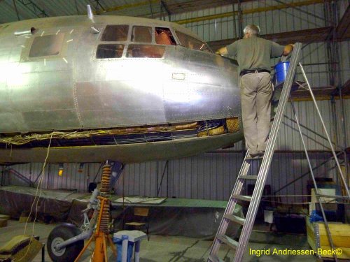 Das Bugrad ist eingehängt. Die Flugzeugnase wird geputzt.