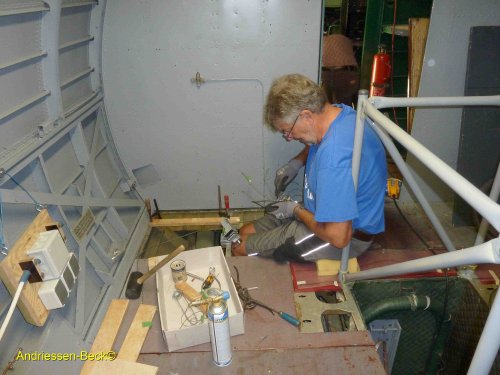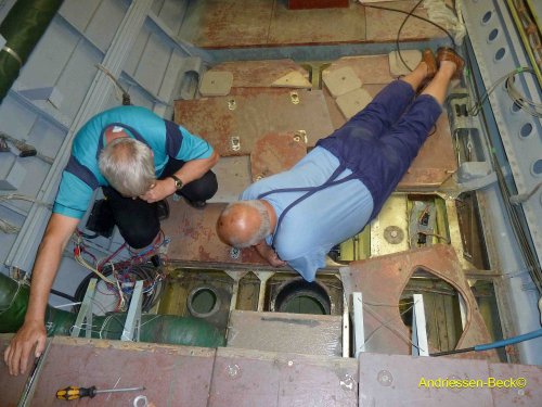 Oktober 2017: Eine schweißtreibende Kunst ist Drahtseilespleißen an schwer zugänglichen Stellen im Rumpf, hier ein Seilzug für das Seitenruder.