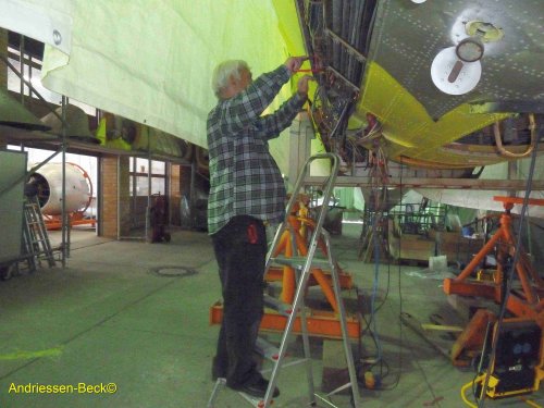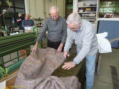 Februar 2017: In der kalten Jahreszeit arbeiten wir lieber in den beheizten Räumen der Werkstatt. Hier wird eine kleinere Dämmmatte für die Kabinenwand angefertigt. Die größeren können wir nicht selber anfertigen.