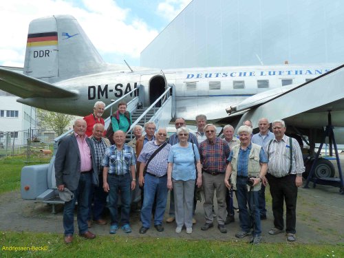 Juni 2017: Am 17. Mai gab es einen „Betriebsausflug” zum Flughafen Dresden zu den Elbe-Flugzeugwerken, wo heute Airbusflugzeuge umgerüstet werden. Früher war das die Vereinigung Volkseigener Betriebe (VVB) Flugzeugbau und hier wurde unsere IL-14P gebaut. Heute steht noch eine IL-14P auf dem Gelände, die wir uns anschauen durften.