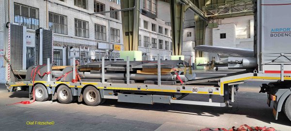 September 2023: Die bespannten Ruder und Landeklappen werden zum zweiten Mal in die Lackiererei gebracht. Wir sind gespannt auf das Ergebnis.