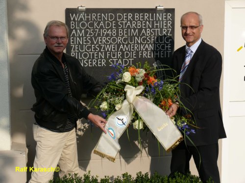 25.07.2023: Unser Arbeitskreissprecher hat anlässlich des 75. Jahrestages des Absturzes eines Rosinenbombers an der Gedenktafel für verunglückte Luftbrückenpiloten eine Rose angebracht.